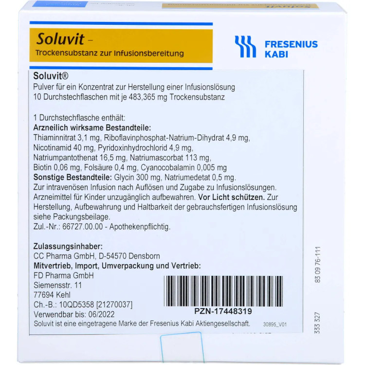 آمپول سولویت ان یک داروی ترکیبی حاوی ویتامینهای محلول در آب (گروه B و ویتامین C) است که اغلب برای بیمارانی که تغذیه وریدی دارند تجویز میشود. خرید این محصول باید با تجویز و مشورت پزشک انجام شود.